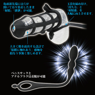 メッシュ状のサックによる持久力サポートと、アナルプラグによる前立腺刺激で射精感を大幅UP!