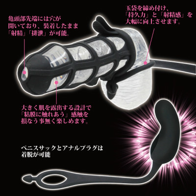 メッシュ状のサックによる持久力サポートと、アナルプラグによる前立腺刺激で射精感を大幅UP!