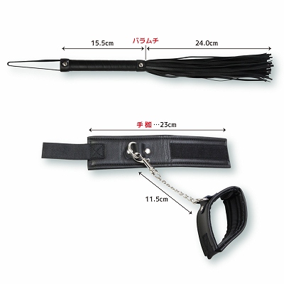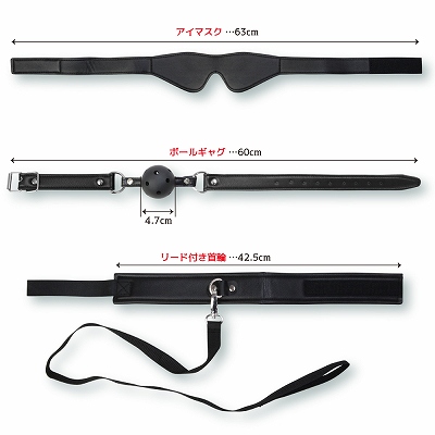 セット内容:アイマスク、ボールギャグ、リード付き首輪、手枷、バラムチ